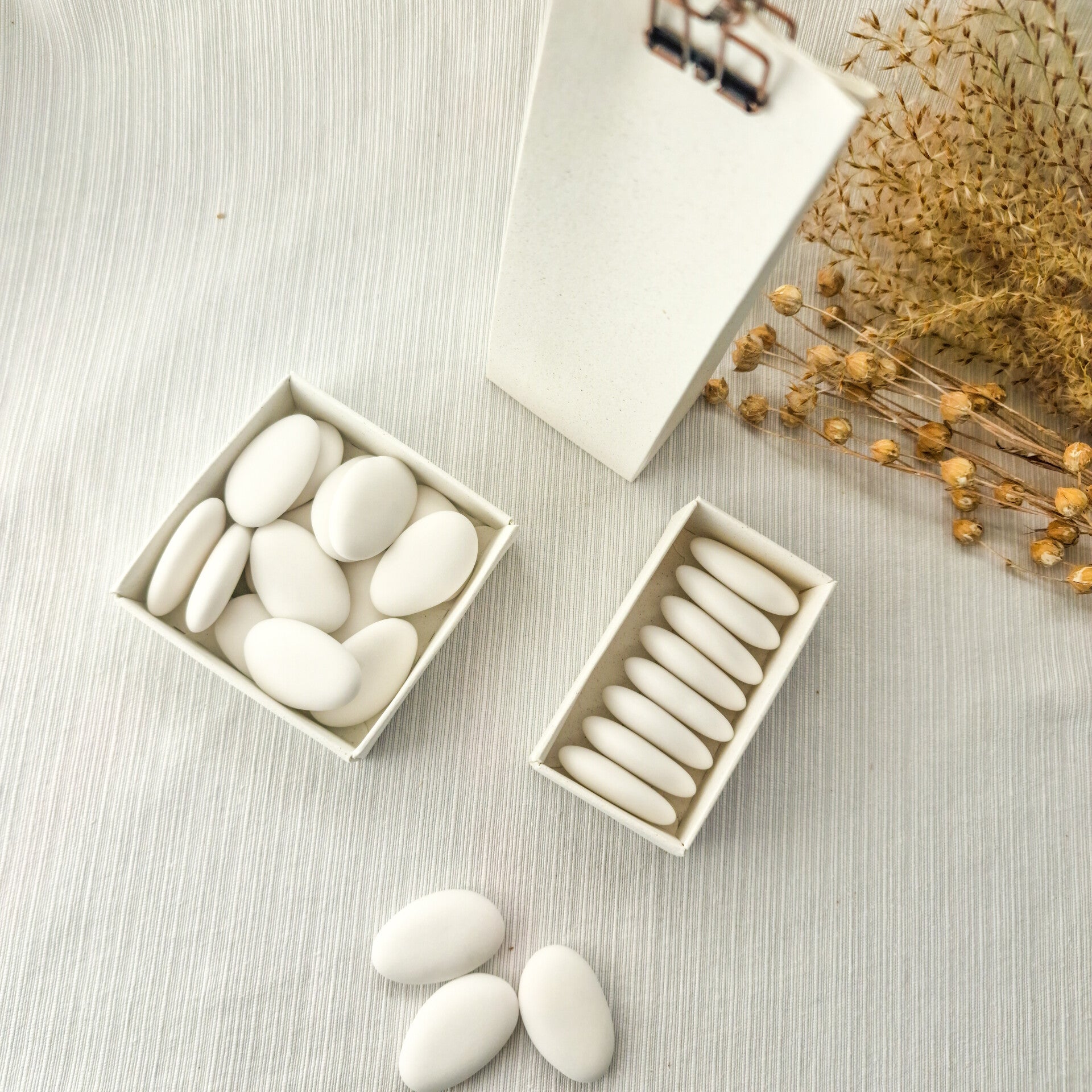 De schuifdoosjes en vierkante doosjes zijn standaard met een mica wikkel (transparant).