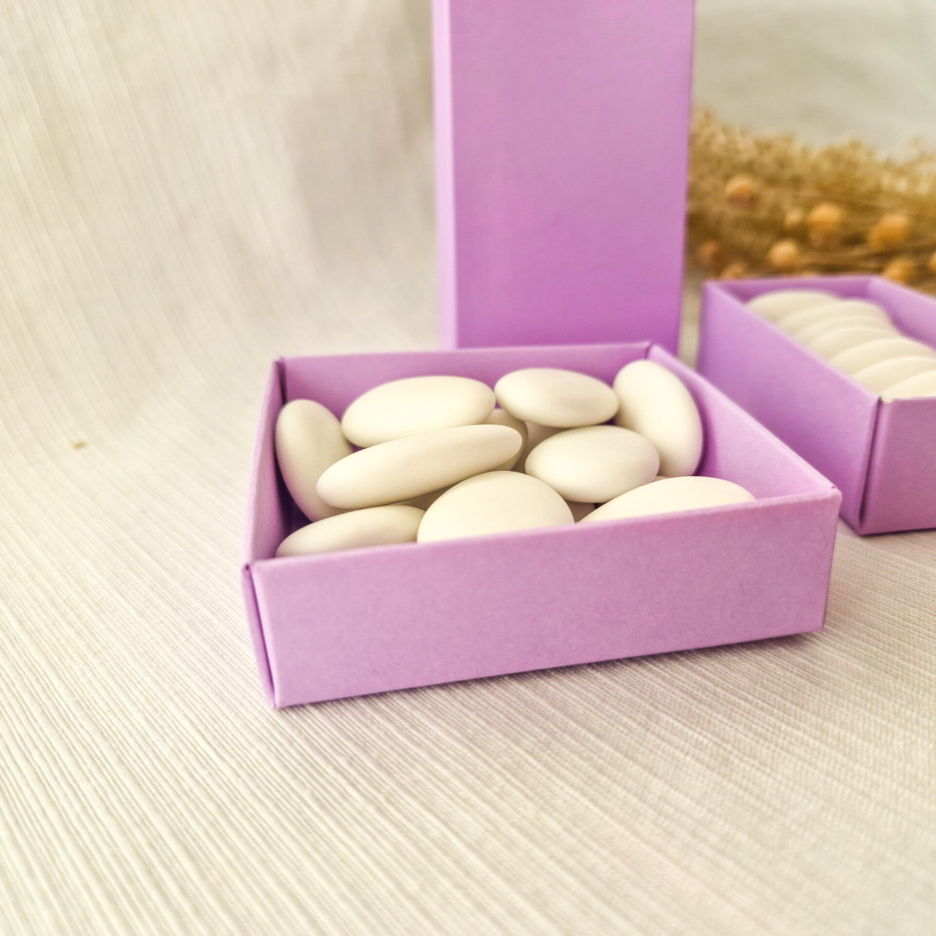De schuifdoosjes en vierkante doosjes zijn standaard met een mica wikkel (transparant).