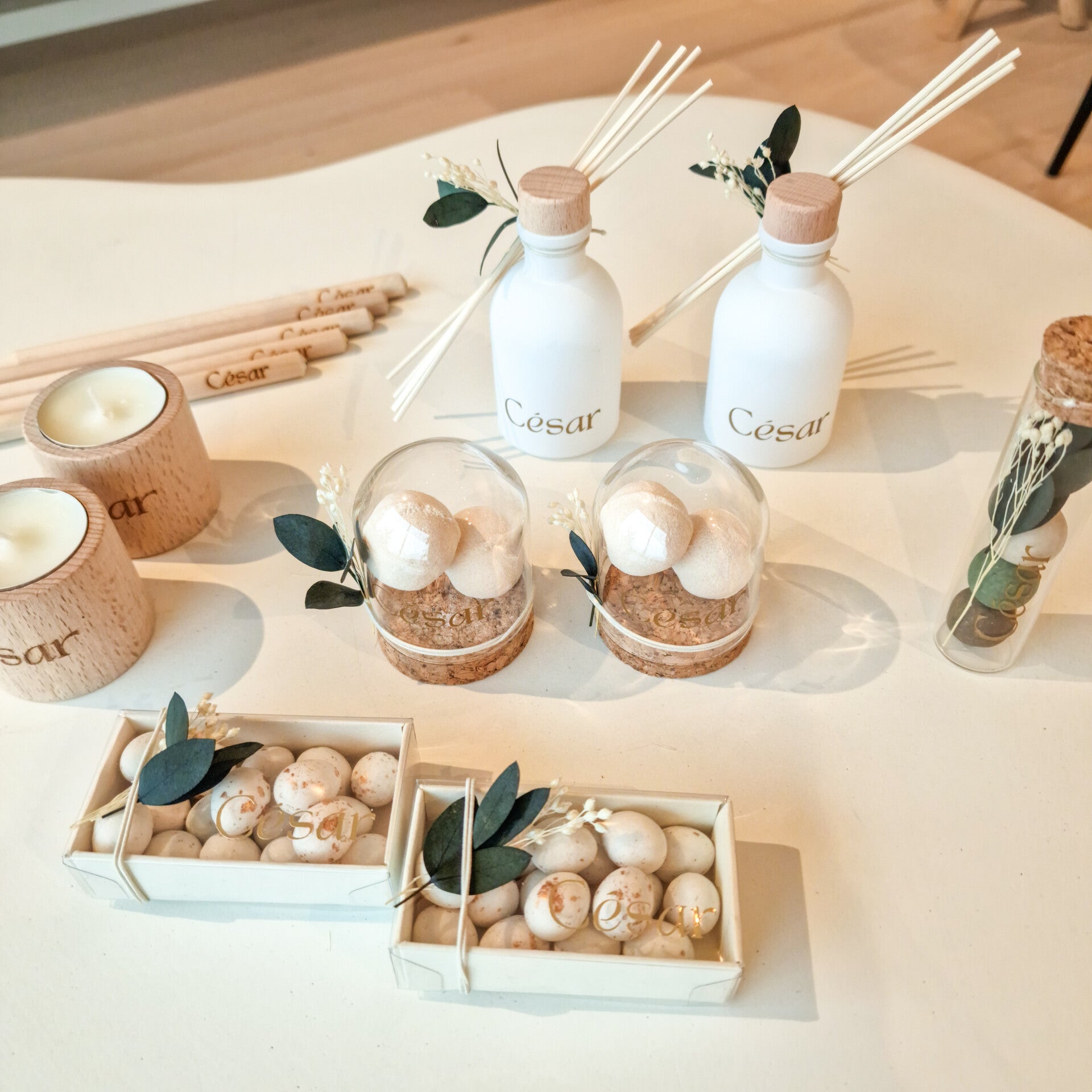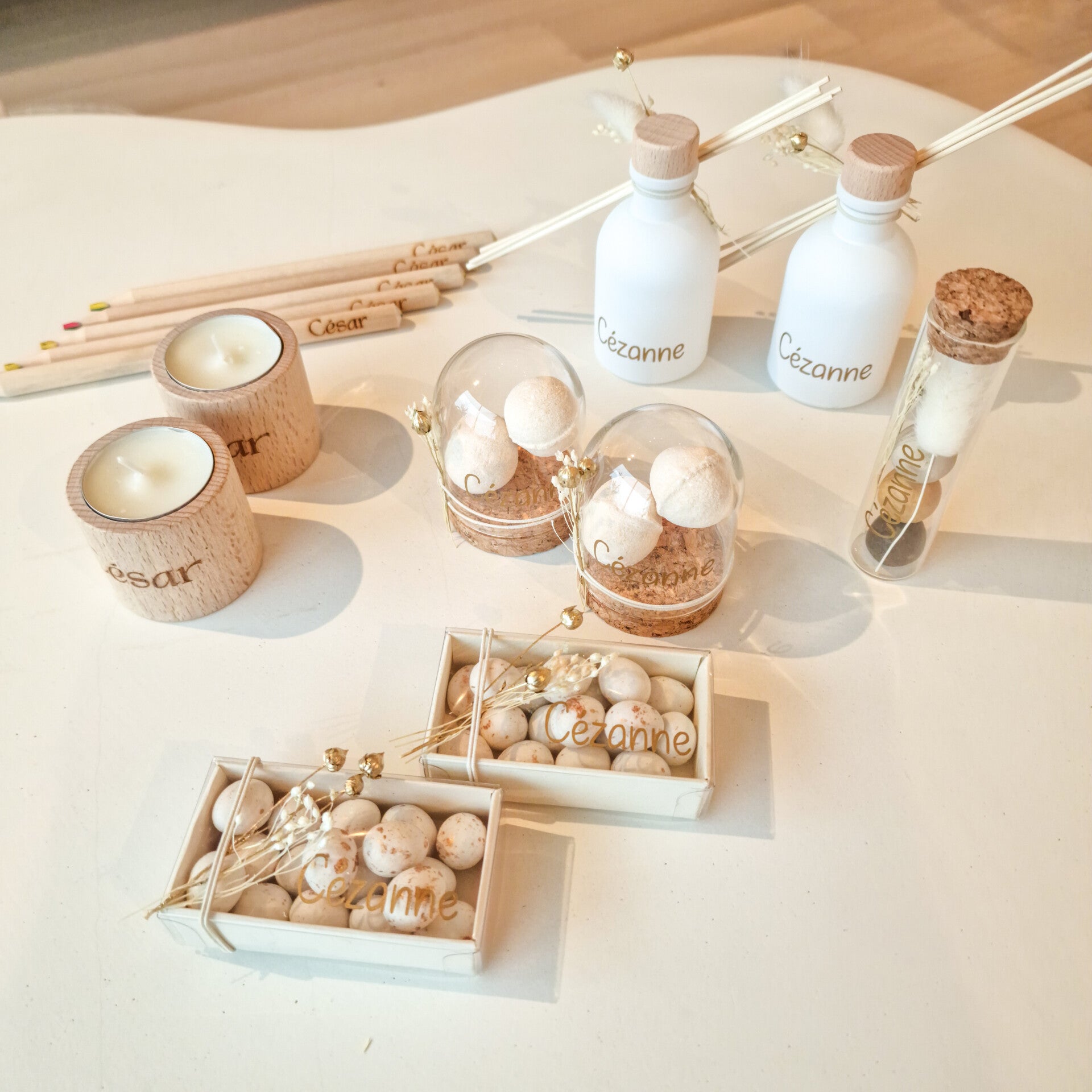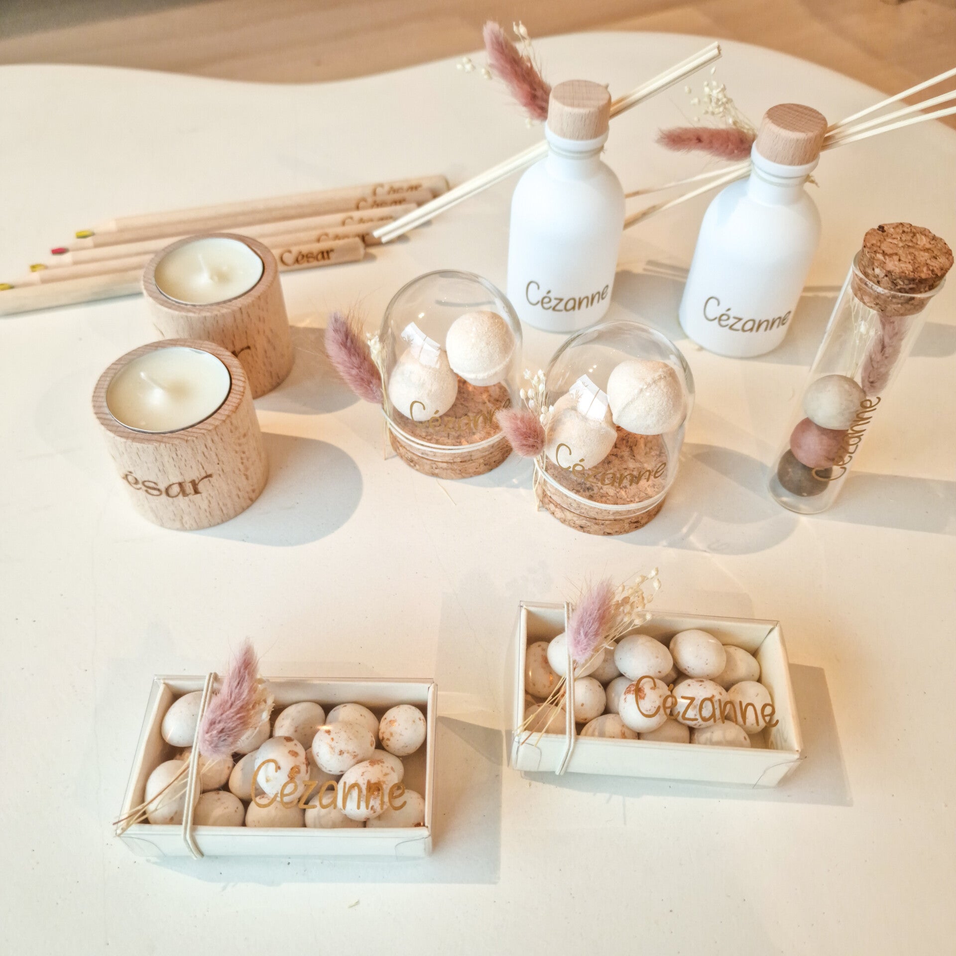 Een mix van 5 verschillende geschenkjes voor de volwassenen. Voor de kindjes kan je gegraveerde meerkleurige potloodjes toevoegen, afhankelijk van het aantal.