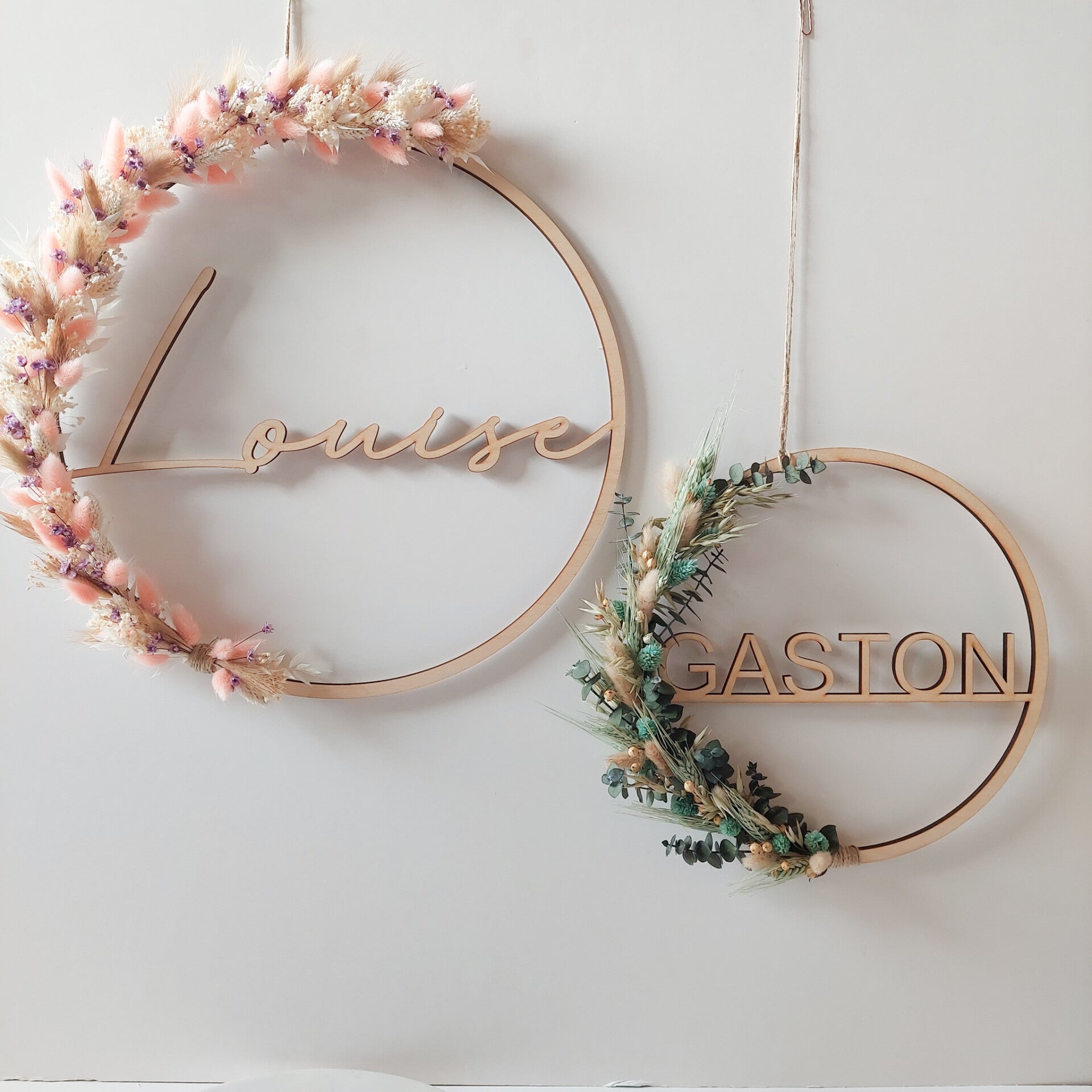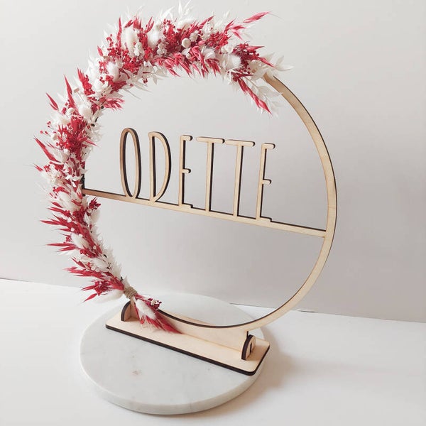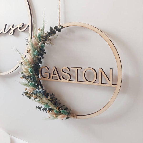 Deze houten naamhoepel past perfect bij je doopsuikerconcept.