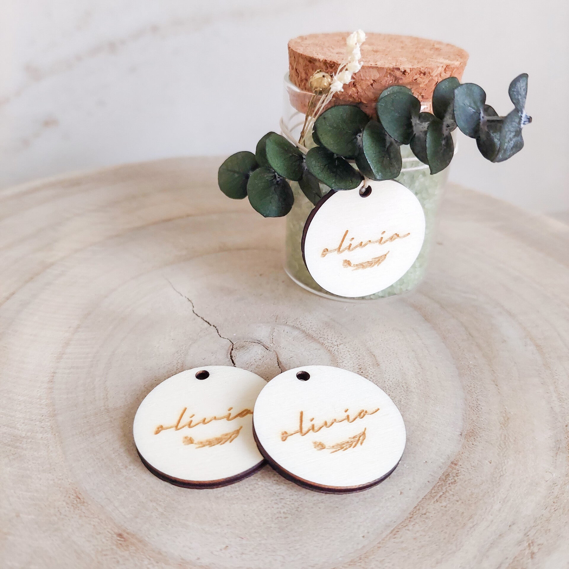 Houten label van 3,5cm diameter met naam gegraveerd.